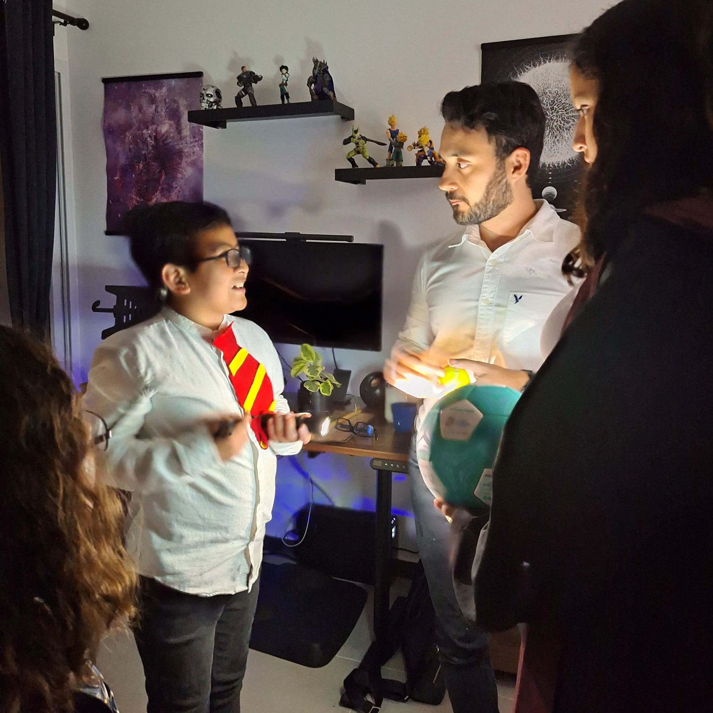 Debido al tamaño del grupo, hicimos la charla en mi estudio. Empecé con una introducción ligera sobre mi equipo de observación y astrofotografía, resaltando las diferencias clave entre ambos. Luego, los niños comenzaron a preguntar. La primera pregunta que lancé fue: “¿Por qué creen que la Luna se ve roja durante un eclipse lunar?”. Las respuestas fueron variadas e intuitivas: “La luz se comporta de manera distinta” o “solo le cae la luz roja”, fueron algunas de las más creativas.